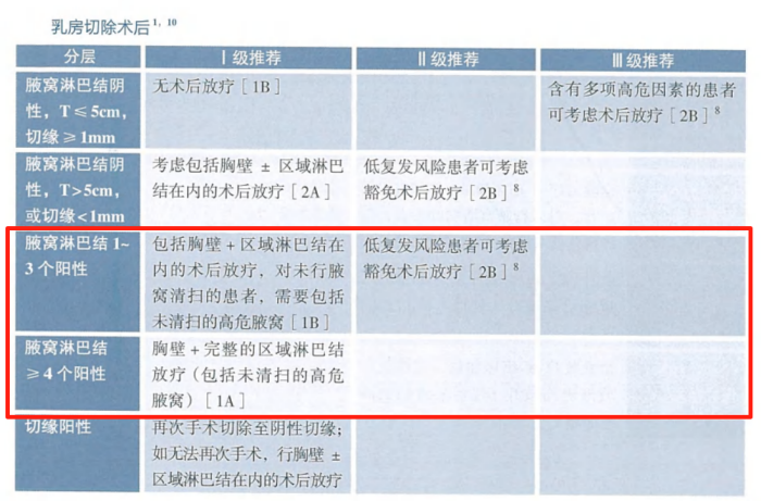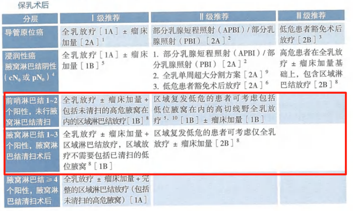 I 级推荐是全乳放疗±瘤床加量+包括未清扫的高危腋窝在内的区域淋巴结照射;