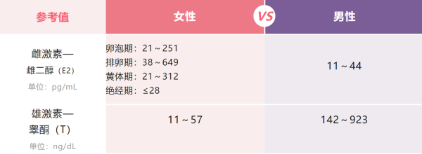 你没看错,女性体内也是有雄激素的;同理,男性体内也会有雌激素,女性、男性的雌激素和雄激素水平参考值如下(不同检测机构的参考值范围可能略微不同)