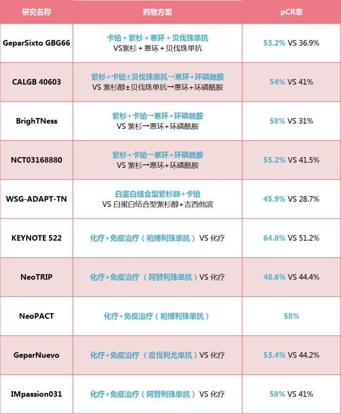 不同新辅助治疗方案的pCR率如下