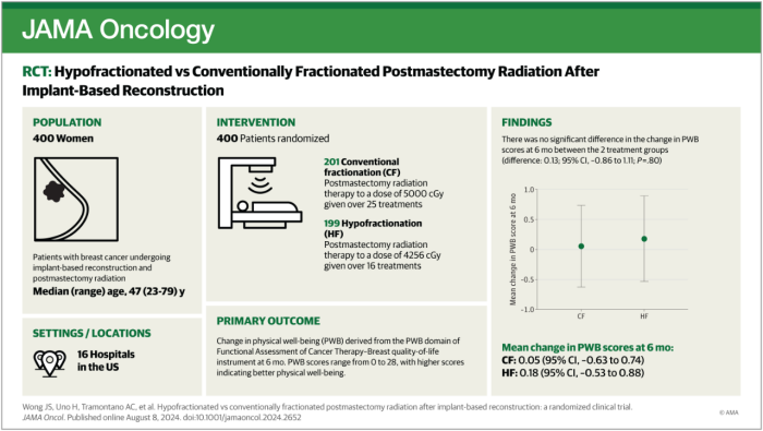 [4] Hypofractionated vs Conventionally Fractionated Postmastectomy Radiation After Implant-Based Reconstruction. JAMA Oncol. 2024 Aug 8; 10 (10): 1370–1378.