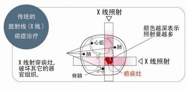 光子,即高能量的 X 射线,在进入人体、到达肿瘤区域前,会逐渐“累积”和释放小部分能量;随后,在肿瘤区域集中释放大部分能量;之后,离开肿瘤区域,在肿瘤区域后方再释放少部分能量。在肿瘤区域的前方和后方,都有正常的组织和器官,例如皮肤、肺、心脏等,因此这些正常的组织和器官都会受到一部分 X 射线的照射,导致副作用。