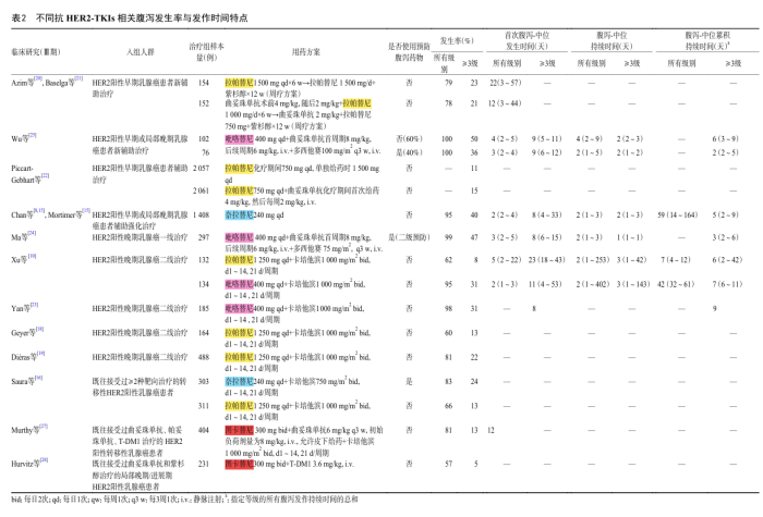 不同亚类 TKI 药物腹泻发生率不同,其中奈拉替尼和吡咯替尼导致腹泻的发生率高于拉帕替尼