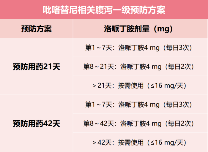 对于服用吡咯替尼的患者,可以考虑预防性服用【洛哌丁胺】21天或42天来降低腹泻的发生率