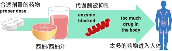 就是西柚+药物=增加药物剂量,从而放大药物毒副作用。