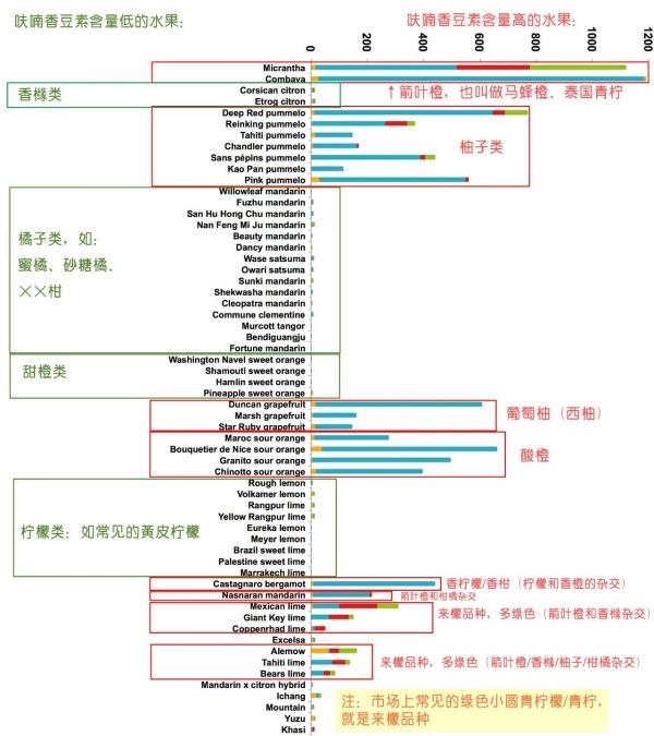 1. 法国洛林大学的科学家曾经测量过 61 种柑橘类水果的呋喃香豆素含量[5]: