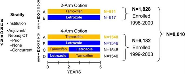 来曲唑于1996年首次在欧盟获批上市,是一种非甾体类AI。为比较来曲唑和TAM作为绝经后激素受体阳性乳腺癌辅助治疗的疗效。