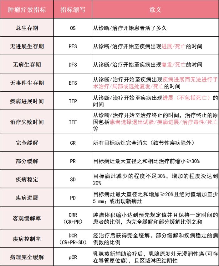 医生在向乳腺癌患者做出病情解释时,经常会提到一些与疗效相关的指标,诸如OS、DFS、PR、CR、pCR等等,不少患者及其家属可能会晕头转向: