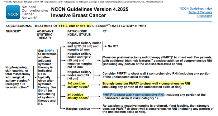 ✔当腋窝淋巴结转移 ≥ 4 枚,I级推荐是胸壁+区域淋巴结放疗,不存在豁免放疗的推荐。