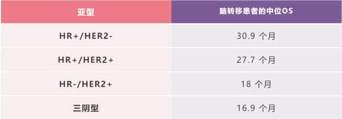 ✦ HR+/HER2- 型乳腺癌脑转移患者的中位总生存期最长,HER-2 阳性型次之,而三阴型乳腺癌脑转移患者的中位总生存期最短。
