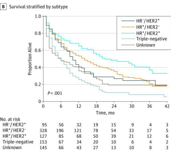 ✦ HR+/ HER-2+亚型的患者中位生存时间最长(21.0 个月);而三阴型的患者中位生存时间最短(6 个月)。