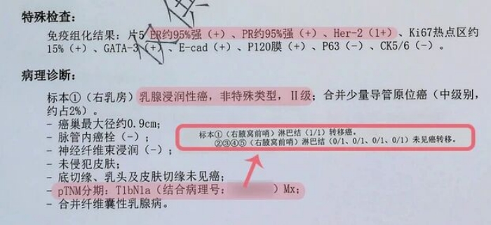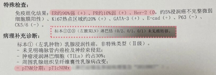 该患者属于早期 HR 阳性、HER-2 阴性乳腺癌,有 1 个淋巴结转移,为了更精准地判断她化疗能否获益,在医生的推荐下做了“70基因检测”,基因检测评估为“低风险”,提示“没有潜在显著化疗获益”,因此豁免了化疗,仅行内分泌治疗即可。