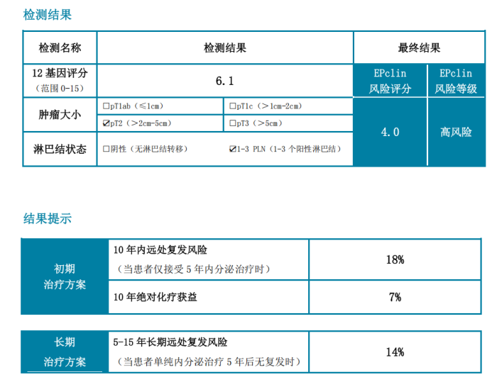 以上信息可以看出,该患者属于早期 HR 阳性、HER-2阴性患者,有 1个淋巴结转移,为了更精准地判断她化疗能否获益,在医生的推荐下做了“12基因检测”,基因检测评估为“高风险”,提示“绝对化疗获益达到7%”,因此建议行化疗+内分泌治疗。