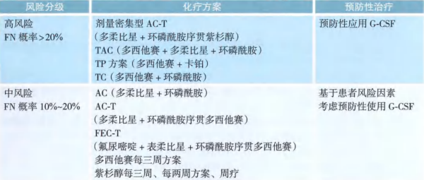 ● 对于下述接受中、高风险FN化疗方案的患者,建议考虑预防性使用升白针