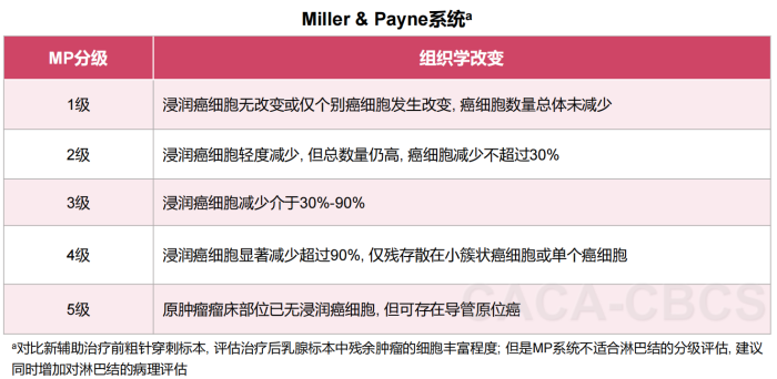 目前国内常用的新辅助治疗病理评估系统是 Miller-Payne(MP)系统,此系统将治疗前空芯针穿刺标本与治疗后的手术标本进行比较,主要针对新辅助治疗后乳腺原发灶残余肿瘤的细胞丰富程度进行评估,分为 1~5 级(G1~G5),级别越高,新辅助效果越好,预后也越好[1-2]。