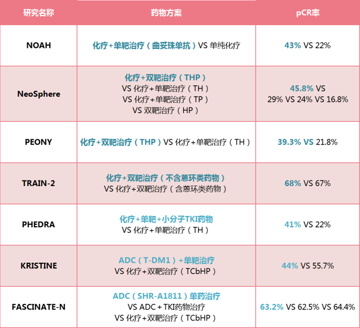 HER-2 阳性型乳腺癌主流的新辅助治疗方案是【化疗联合双靶治疗】,pCR 率普遍能达到 40% ~ 68%。相当于 10 个患者中,有 4~6 人能拿到满分答卷。