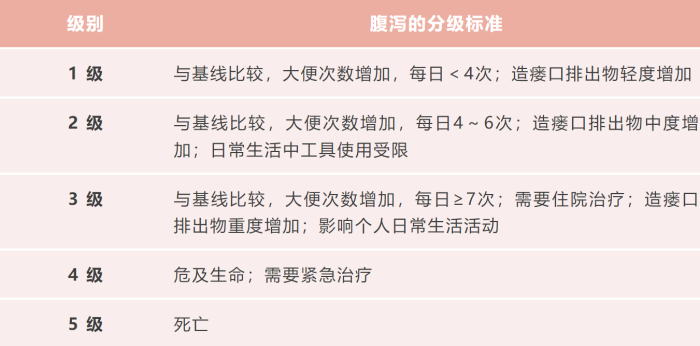 大部分 ≥ 3 级患者的腹泻中位时间为 2 ~ 5 天