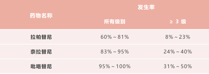 不同亚类 TKI 药物腹泻发生率不同,其中奈拉替尼和吡咯替尼导致腹泻的发生率高于拉帕替尼