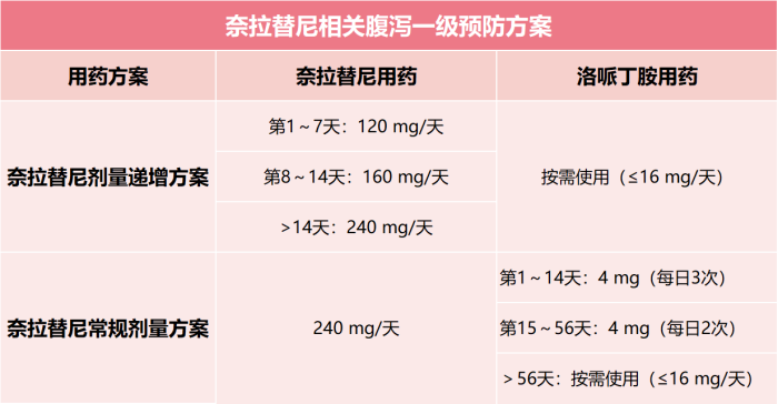 对于服用奈拉替尼的患者,建议采用 2 周剂量递增方案,或预防性服用止泻药【洛哌丁胺】56 天来降低腹泻发生率