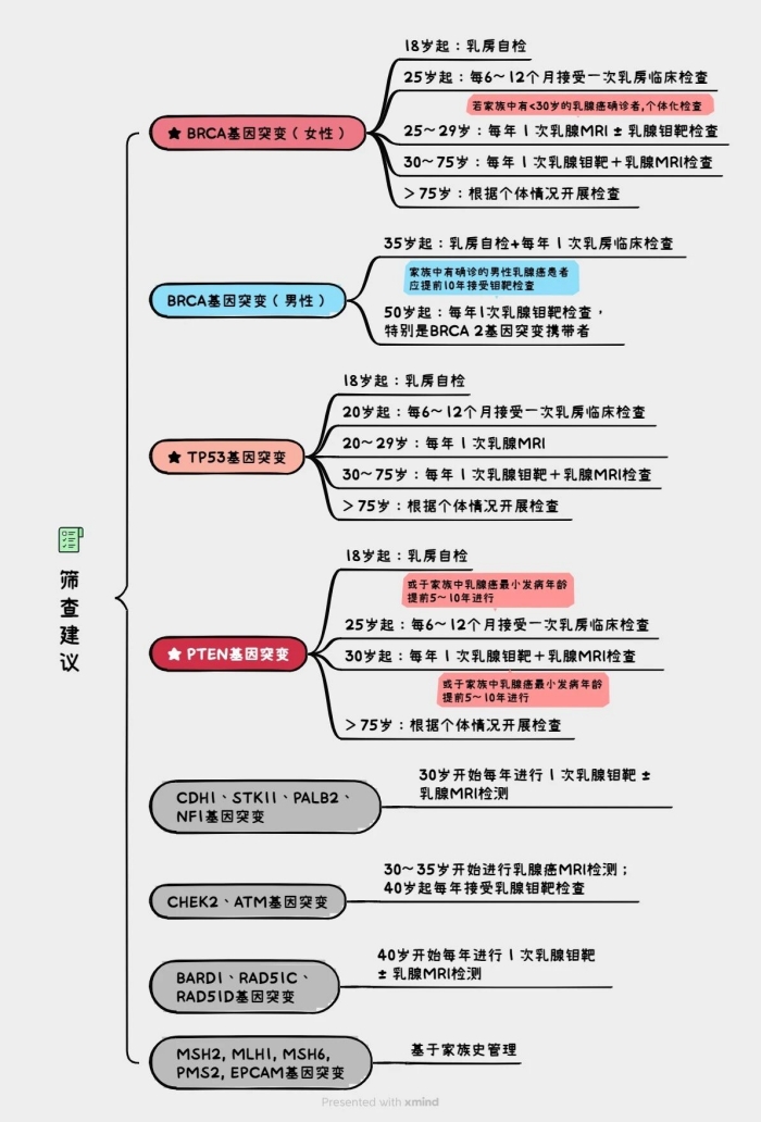 2. 携带高危基因突变者需强化筛查,必要时结合药物或手术干预。