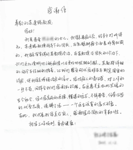 我是患者***的女儿,我母亲患病之后,经多方打听得知,苏逢锡教授领导下的团队,在乳腺肿瘤方面是非常权威的,我母亲有幸得到苏教授的诊治。在苏教授及团队的诊治下,我们更加清晰地了解病情以及更好地照顾到母亲。苏教授详细的问诊与仔细的检查,让我们感受到优质服务与制定周密的诊疗,使我母亲增强治疗的信心。您对病人的责任感、对工作的一丝不苟,同样令我们感激和钦佩。在医患关系如此紧张的当今社会,您以您高尚的医德、精湛的医术、不辞劳苦、任劳任怨的优秀品质,浇铸了您——一个医生该有的高大形象。在此,我代表我母亲及家人,感谢您及团队的辛勤付出。