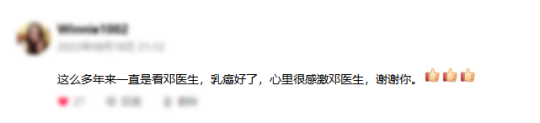 这么多年来一直都是看邓贺然医生,乳癌好了,心里很感激邓医生,谢谢你。