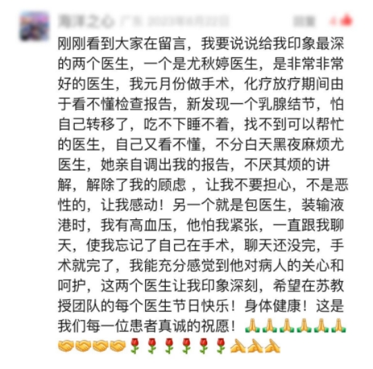 另一个就是包浩世医生,装输液港时,我有高血压,他怕我紧张,一直跟我聊天,使我忘记了自己在手术,聊天还没完,手术就完了,我能充分感觉到他对病人的关心和呵护,这两个医生让我印象深刻,希望在苏教授团队的每个医生节日快乐!身体健康!这是我们每一位患者真诚的祝愿!