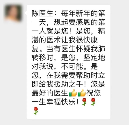 每年新年的第一天,想起感恩的第一人就是您!是您,精湛的医术让我很快康复;当有医生怀疑我肺转移时,是您,坚定地对我说,不可能;是您,在我需要帮助时立即给我援助之手!您是最好的医生祝您一生幸福快乐!
