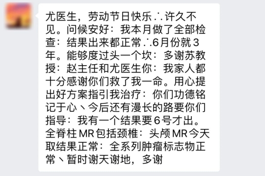 我本月做了全部检查,结果出来都正常,6月份就3年了,能够度过头一个坎,多谢苏逢锡教授、赵健丽教授和尤医生您。我家人都十分感谢你们救了我一命,用心提出好方案指引我治疗,你们功德铭记于心,今后还有漫长的路要你们指导。我有一个结果要6号才出,全脊柱MR包括颈椎、头颅MR结果正常,全系列肿瘤标志物正常,暂时谢天谢地,多谢
