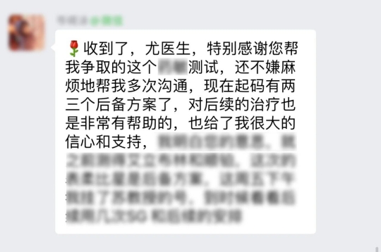 尤医生,特别感谢您帮我争取的这个测试,还不嫌麻烦地帮我多次沟通,现在起码有两三个后备方案了,对后续的治疗也是非常有帮助的,也给了很大的信心和支持!
