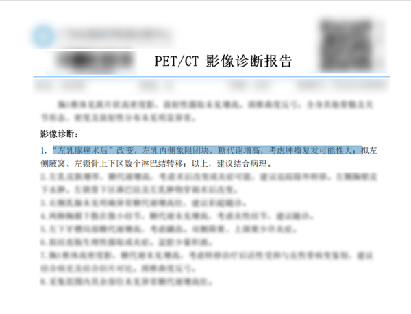 直到第三次常规复查时,她的三个乳腺肿瘤指标同时升高,但是当地的彩超依旧提示无异常,当地医生让她放心。为求心安,W女士选择回到门诊部再次复查,虽然彩超没有发现明显的肿物,但是医生在查体时发现,W女士的两侧乳房已经出现明显不对称,且一侧乳房的皮肤出现了改变,建议W女士进行穿刺和PET-CT检查,很遗憾,结果提示局部复发。
